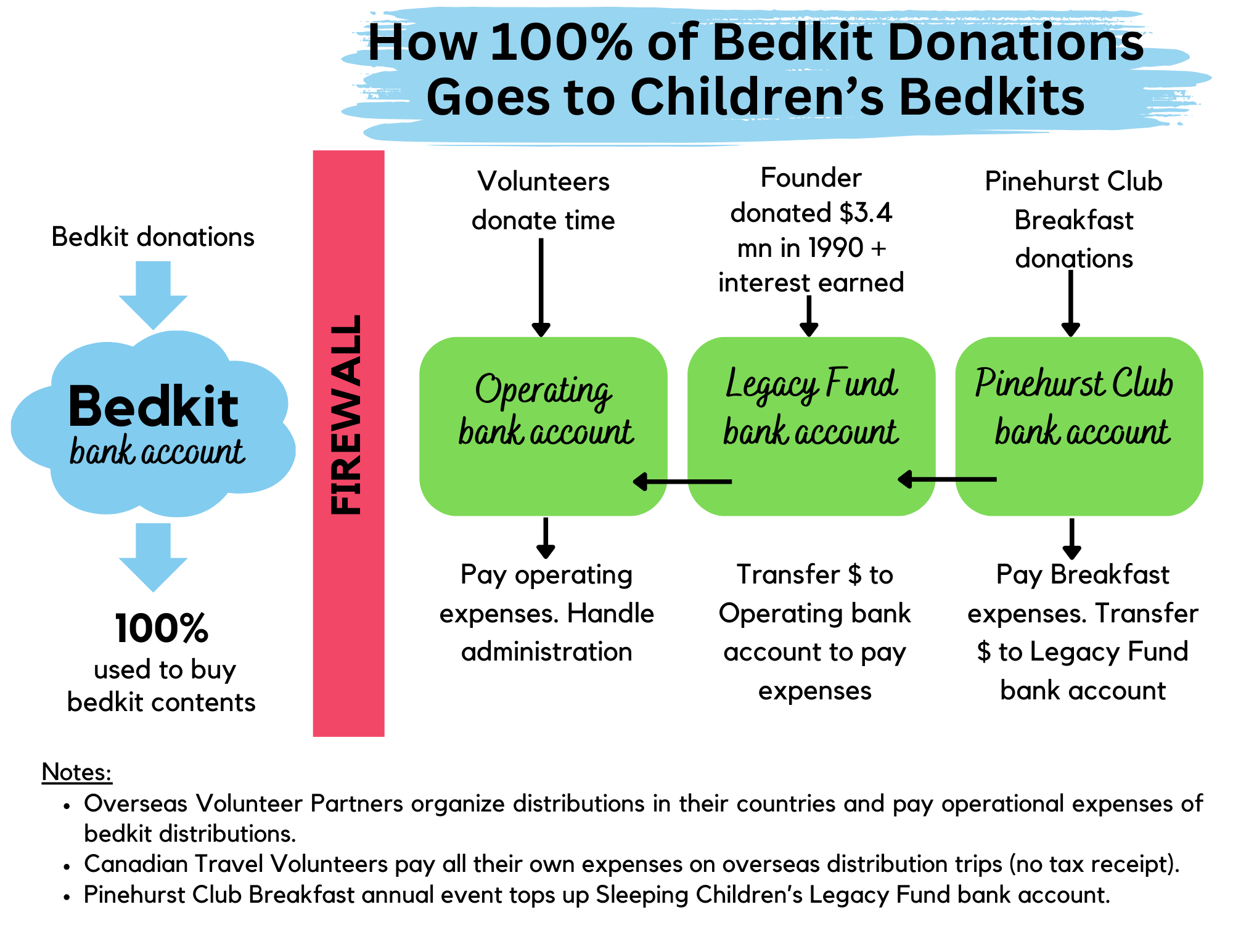 100% of bedkit donations go to contents, thanks to a Legacy that founder Murray Dryden set up, that pays operating expenses, as shown below: