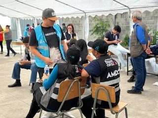 We arrived at the school, Pedro Nufio, which we had visited yesterday post-distribution to scope out the best site for picture-taking and to develop flow logistics. The municipality had set up a large tent providing shade over the small centre court for the children to enter, be dressed in t-shirts and given backpacks, and be ready to move for picture-taking.